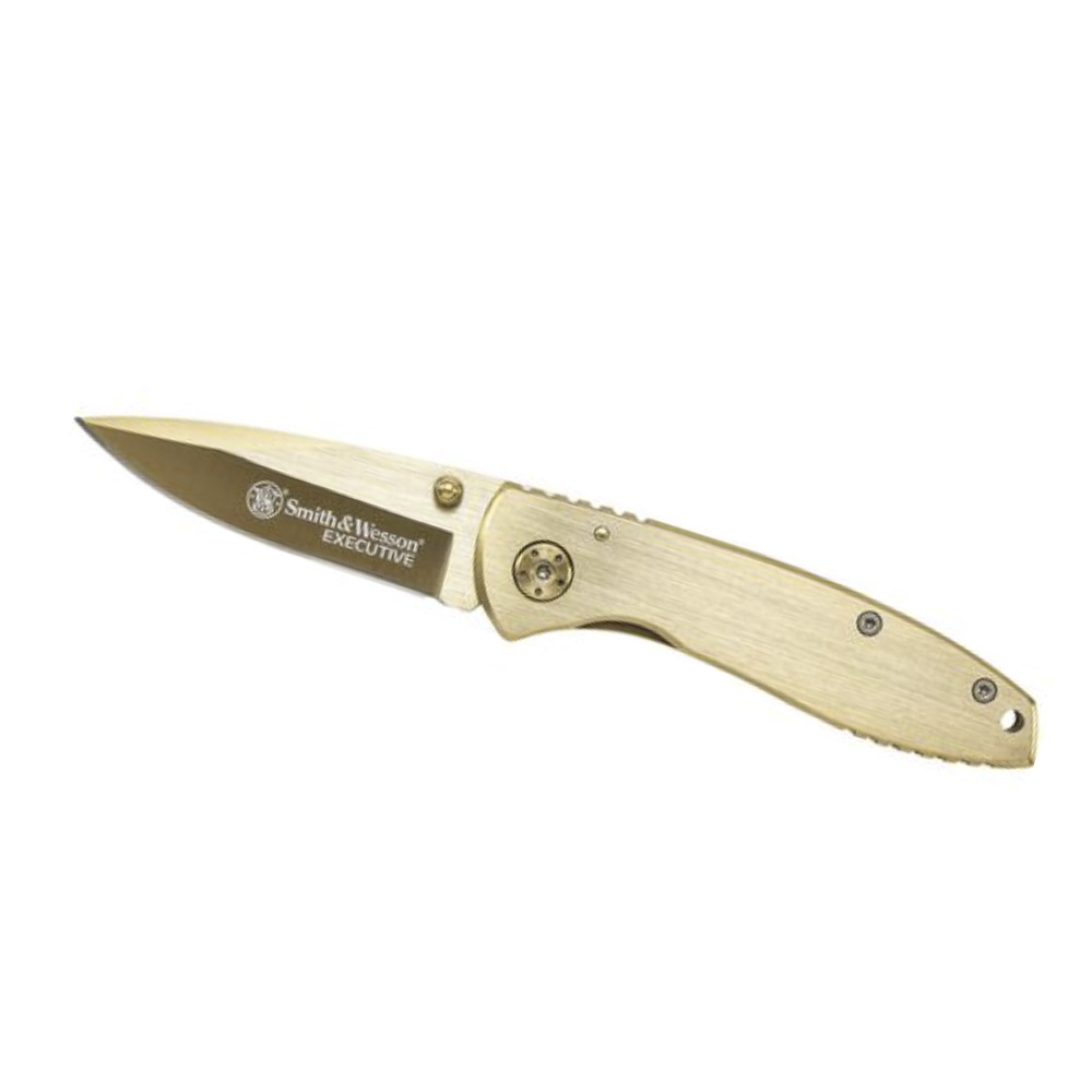 It’s a sleek, high-performance knife for the discerning gentleman – a combination of elegance and reliability. The gold titanium-coated handle exudes sophistication, while the frame lock ensures secure use. In addition, the ambidextrous thumb knobs and pocket clip make the Smith & Wesson Executive Gold Knife perfect for everyday carry!